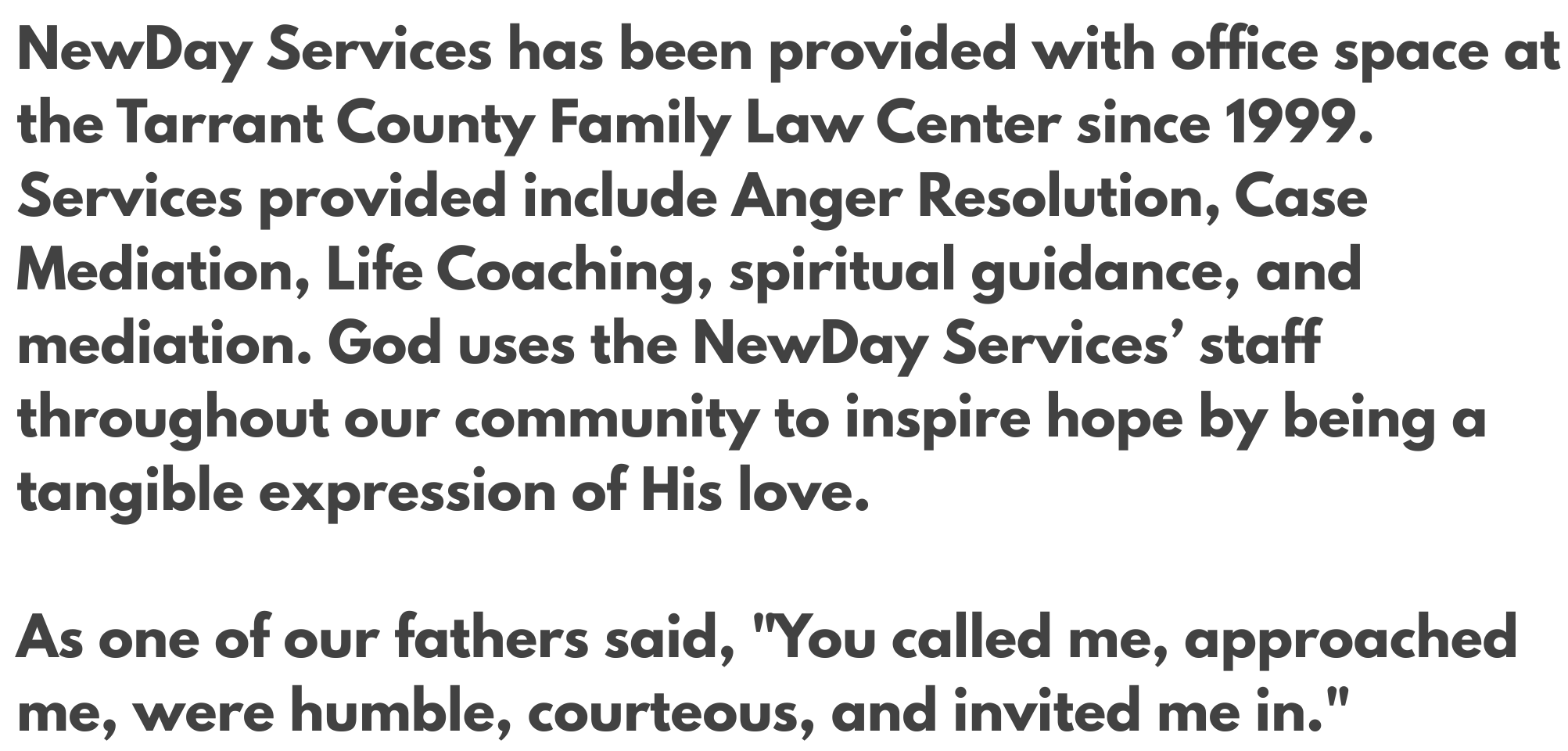 Rewind 20 years ago, NewDay Services held one FOCUS Fatherhood class weekly in Fort Worth. Fast forward to today, we serve fathers and mothers in 64 Counties with 22 classes weekly. In 2004, we served approximately 100 parents with FOCUS Fatherhood classes and now we serve over 1,900 fathers and mothers a year in our FOCUS+ programs. WOW, that is what you call growth!
