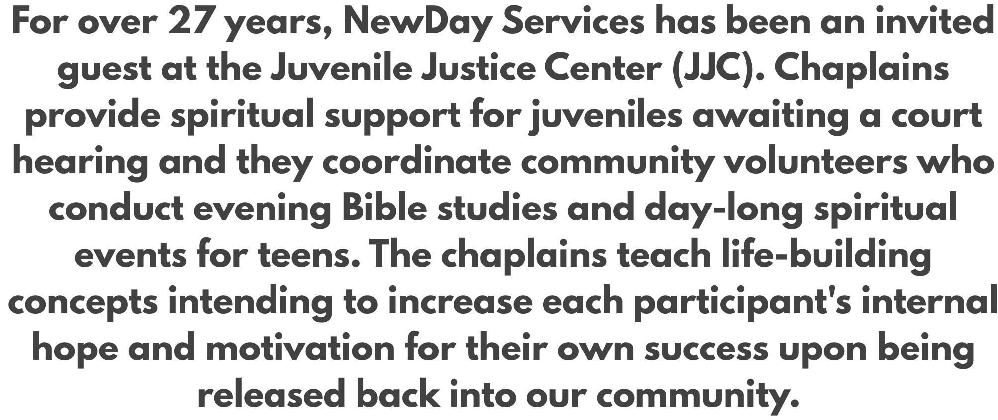 The remainder of my time was spent answering calls from individuals inquiring about how to register for NewDay’s FOCUS+ Parenting or Anger Resolution courses. I also coordinated the twice-weekly online devotional with NewDay staff and met monthly to encourage Kristi and Mike, the two chaplains at the Juvenile Detention Center.