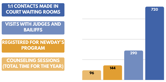 The second largest portion of my time was devoted to building relationships with bailiffs, judges, and other courthouse staff. I regularly reminded them about our NewDay parenting and anger resolution courses and let them know I was available to support them in any way they needed. These conversations sometimes led to referrals for parenting or relationship counseling and encouragement.